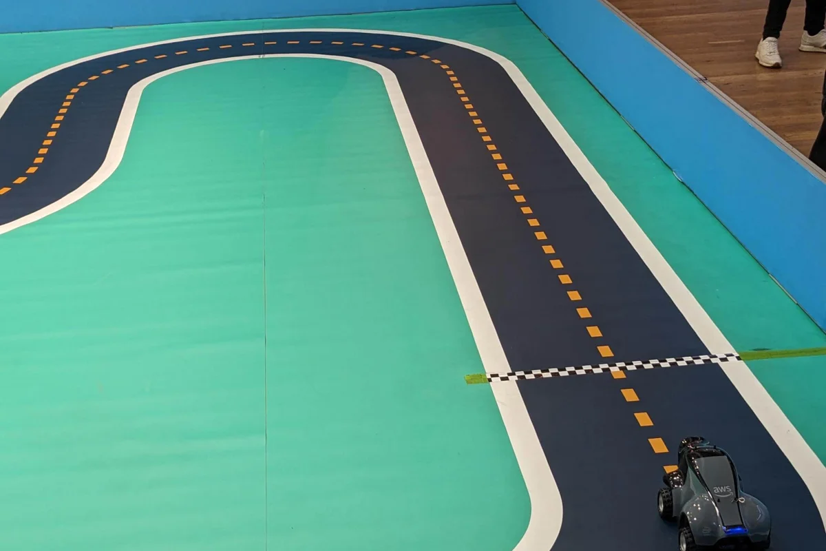 It was very interesting to see the effects of reality on the model behaviour. Everything was slightly off from the simulation, from the width of the track, the bumps in the mat surface, visible lines where the mats joined, shadows cast by the Amazon team member following the car from behind in case it went off track, to the existence of an AWS logo in the “grass” area which was not in the virtual environment. Everything had an effect but one thing that struck me was the unrecoverable state of having lost sight of the yellow centre line. Once the front-facing camera on the buggy had lost sight of this, for almost all competitors, including my own model, the buggy careered off into a wall either directly or with its wheels stuck at some steering angle.