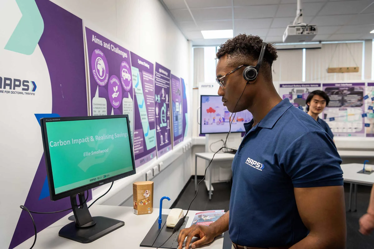 Back to the posters, which we were assuming to be A1 in size (we were wrong), we thought they could do with a nicely painted backing plate to make them free standing – as no one wants flimsy posters at an exhibition. The plan was to buy MDF backing boards and to paint them with an AAPS branded paint, obviously this was the next thing to go wrong. Having scoured the local hardware stores for a couple of days for enough MDF for the posters as well as the right shade to paint them, a collective effort from the cohort saw the boards painted by 7pm 3 days before the exhibition. It later transpired that the posters were in fact self-standing and A0; noticeably larger than the backing boards we spent days sourcing and painting. This was really a blessing in disguise, as the larger posters filled the vast space we were given perfectly. A selection of premium chocolates were also procured to entice visitors to our exhibit (not that they could miss it given we took up a quarter of the room). And the last piece to tie up our exhibit was matching polo shirts for our cohort, with the icing on the cake being the QR codes printed on the back which led to our page on the AAPS website. An idea so ingenious that everyone in the CDT eventually ended up with their own polo shirts (you’re welcome Jess).