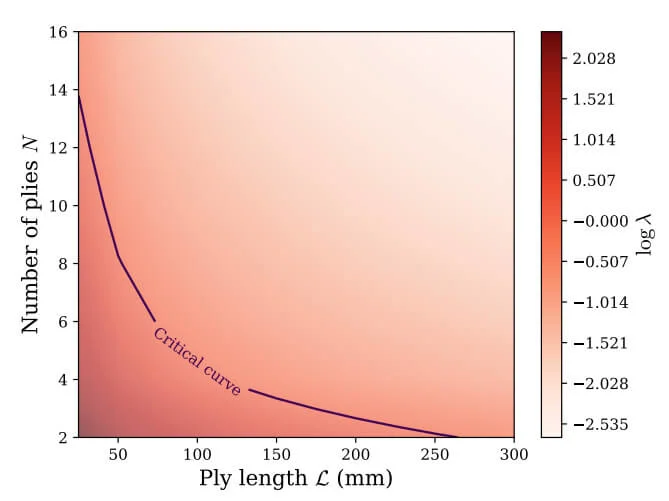 The figure shows a carpet plot depicting the formability of one test case with fixed parameters except for the number of plies in the stack and the length of the plies. The critical curve shows the cutoff where we would expect wrinkling - above the curve we predict wrinkling to occur and below we do not. This is just one example of how the model can be used, and it took only a couple of minutes to run the code for all test cases and generate the plot.